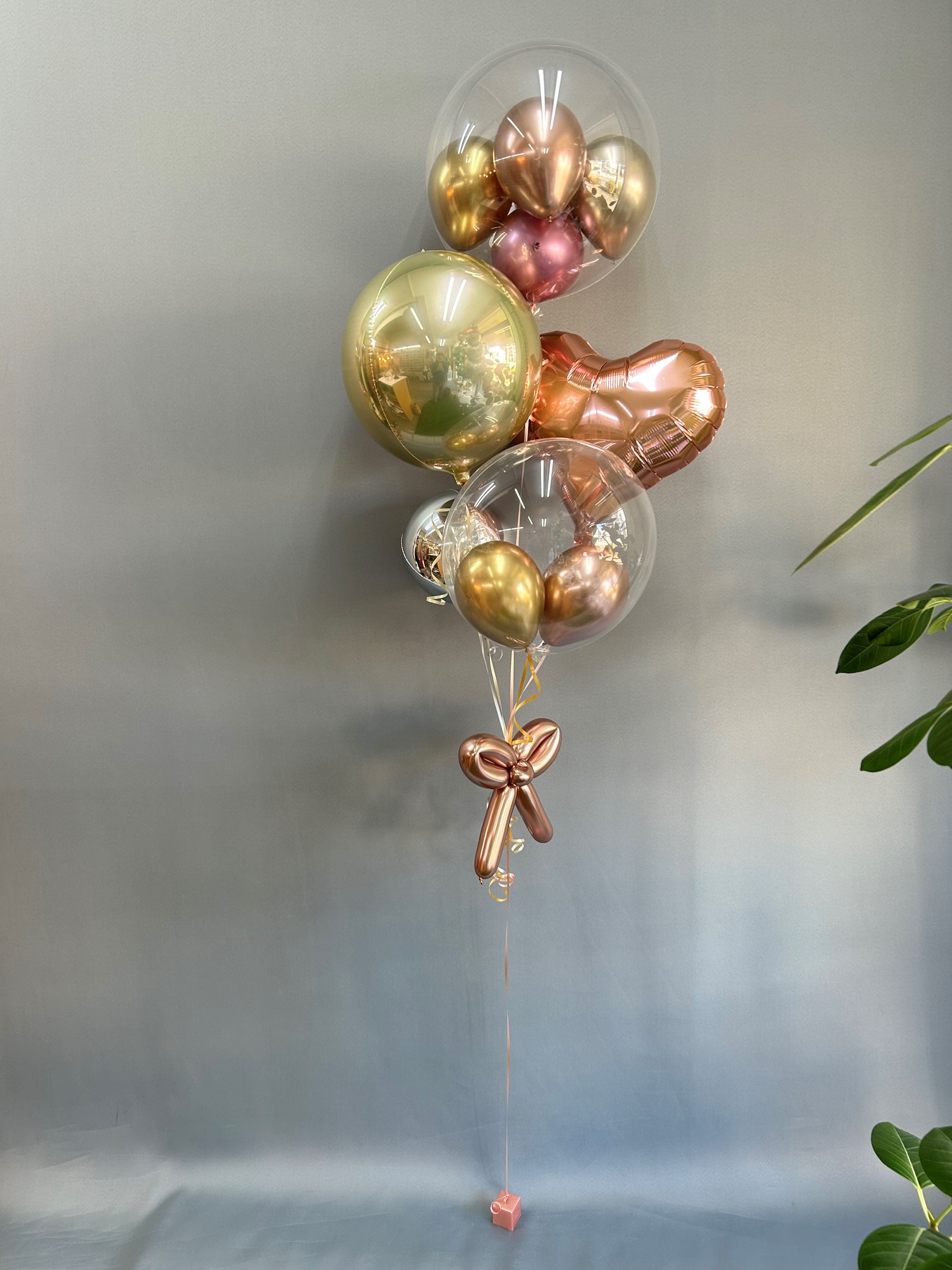 透明バルーンの中に小さな風船が入ったバルーン、ハート、まん丸バルーンを組み合わせた、シンプルでオトナ可愛いバルーンブーケです。