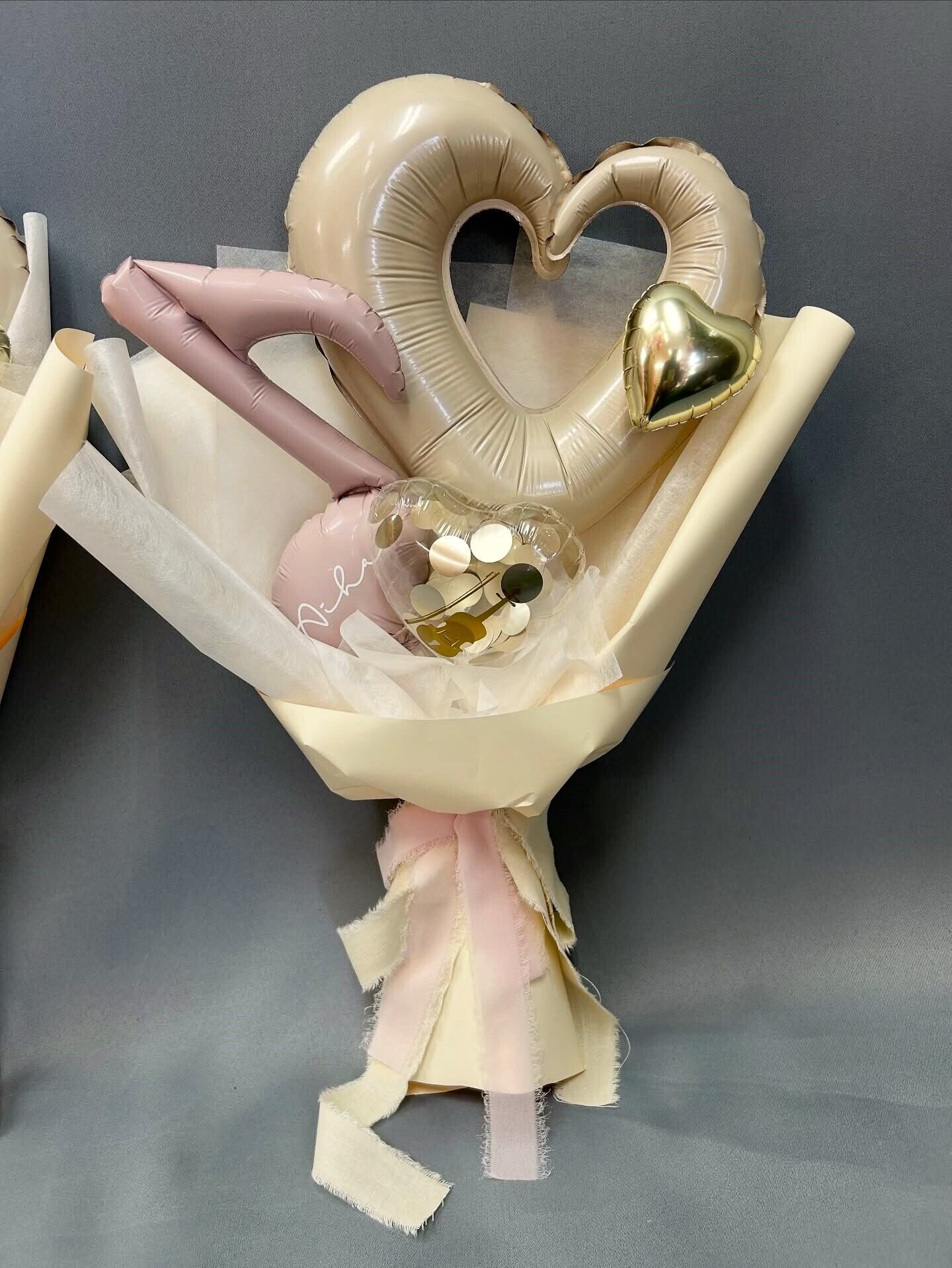大切なシーンを華やかに彩る、**ハート型フィルムバルーンをメインにしたバルーン花束(バルーンバンチ)**です。